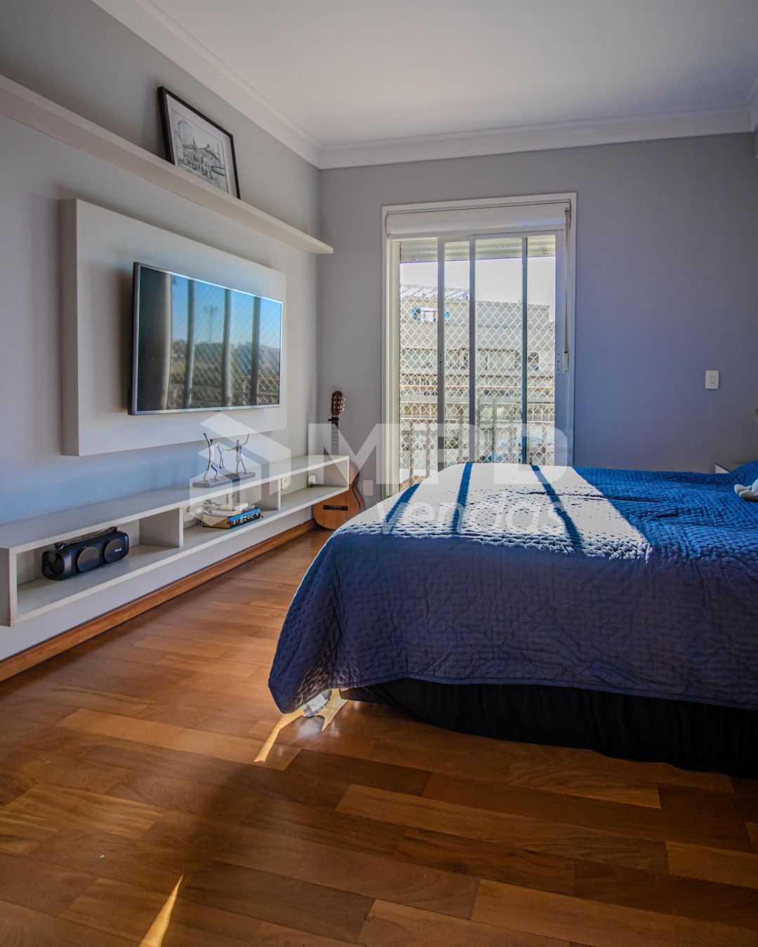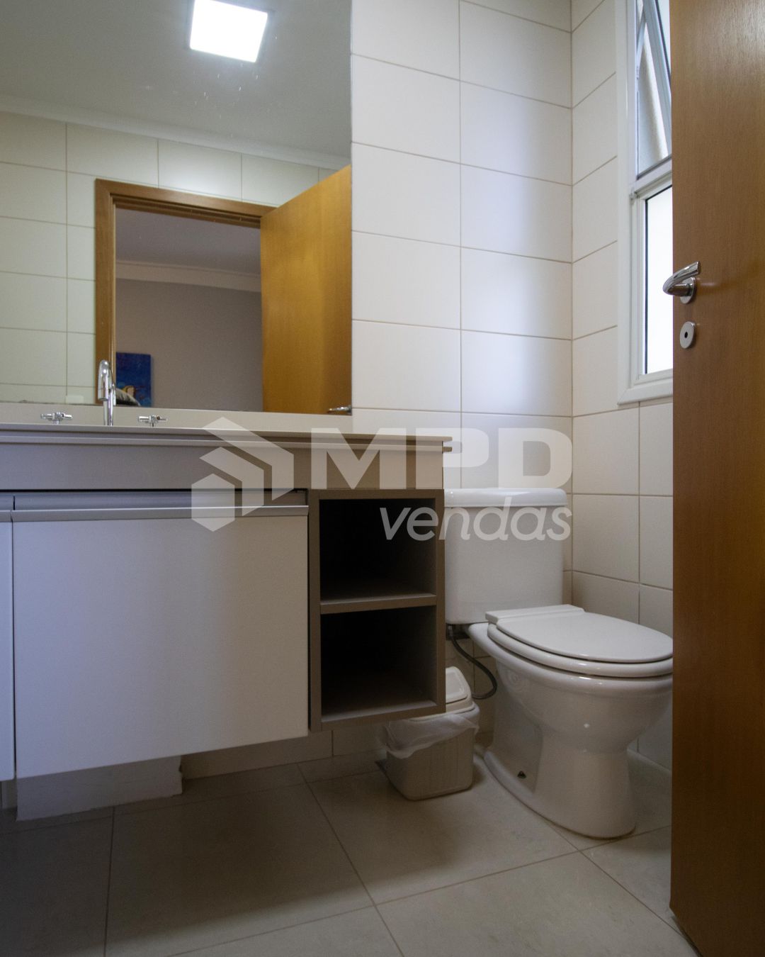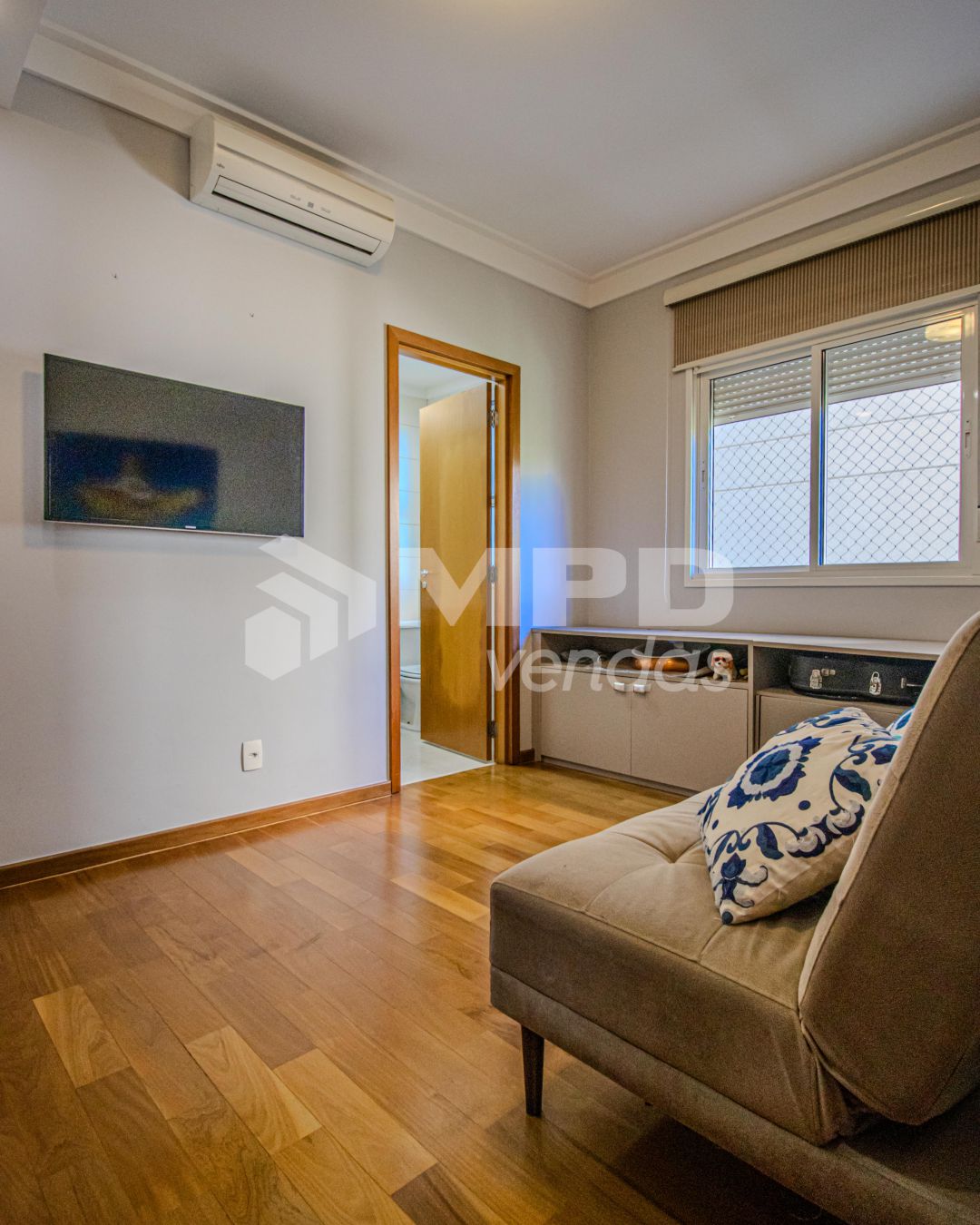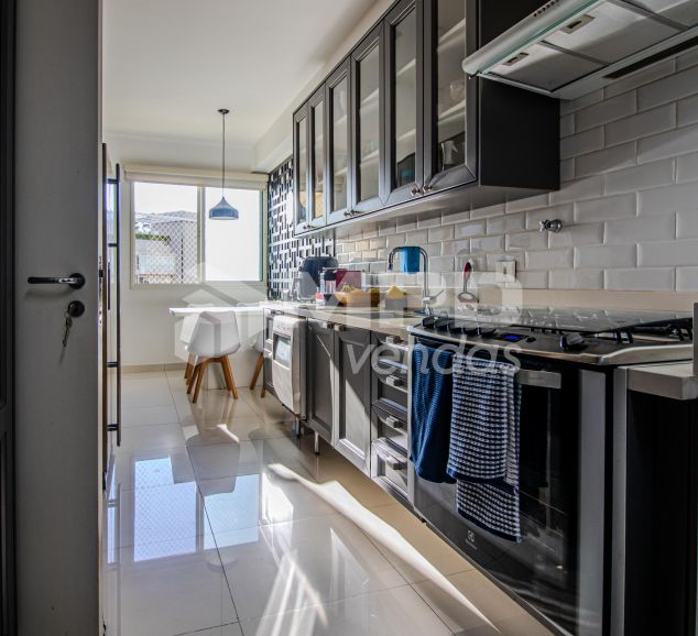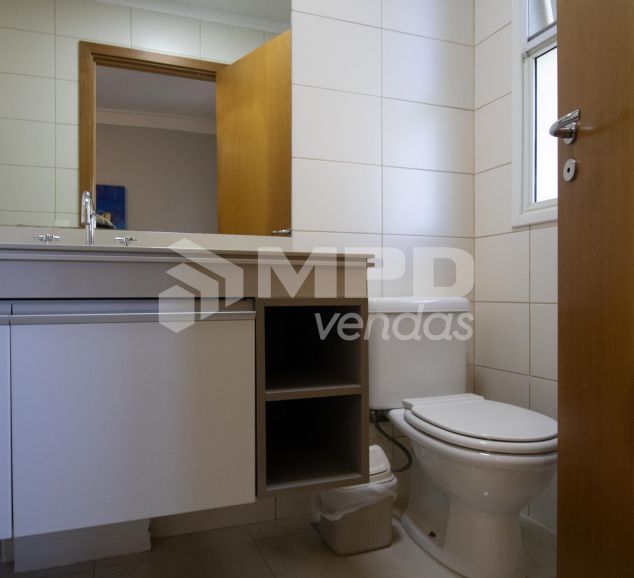 Piso porcelanato na sala e cozinha, piso de madeira nas suítes;