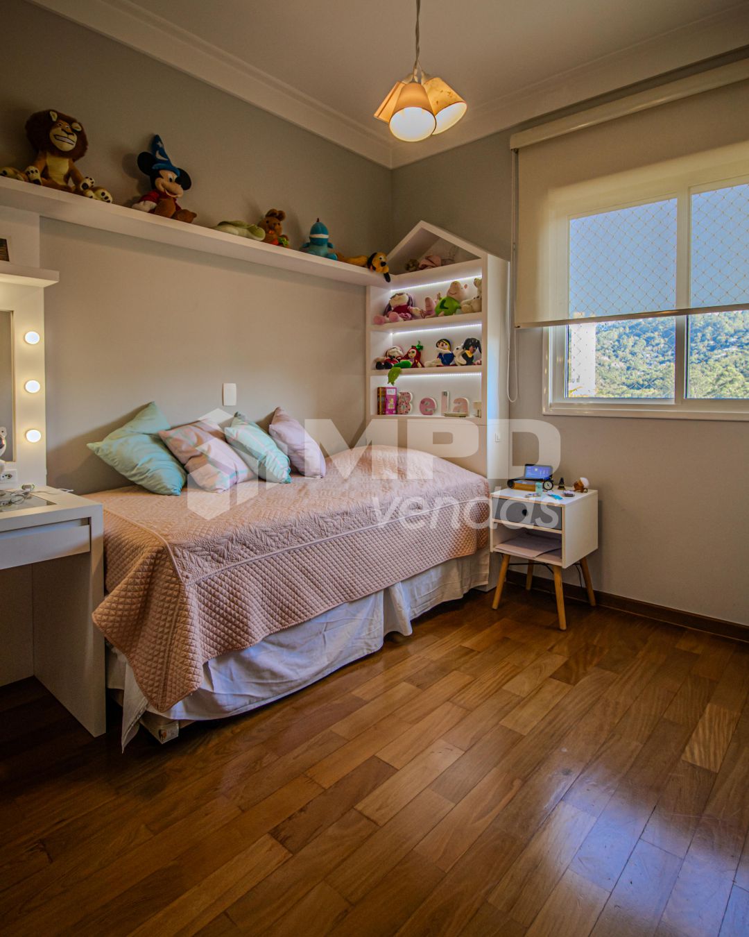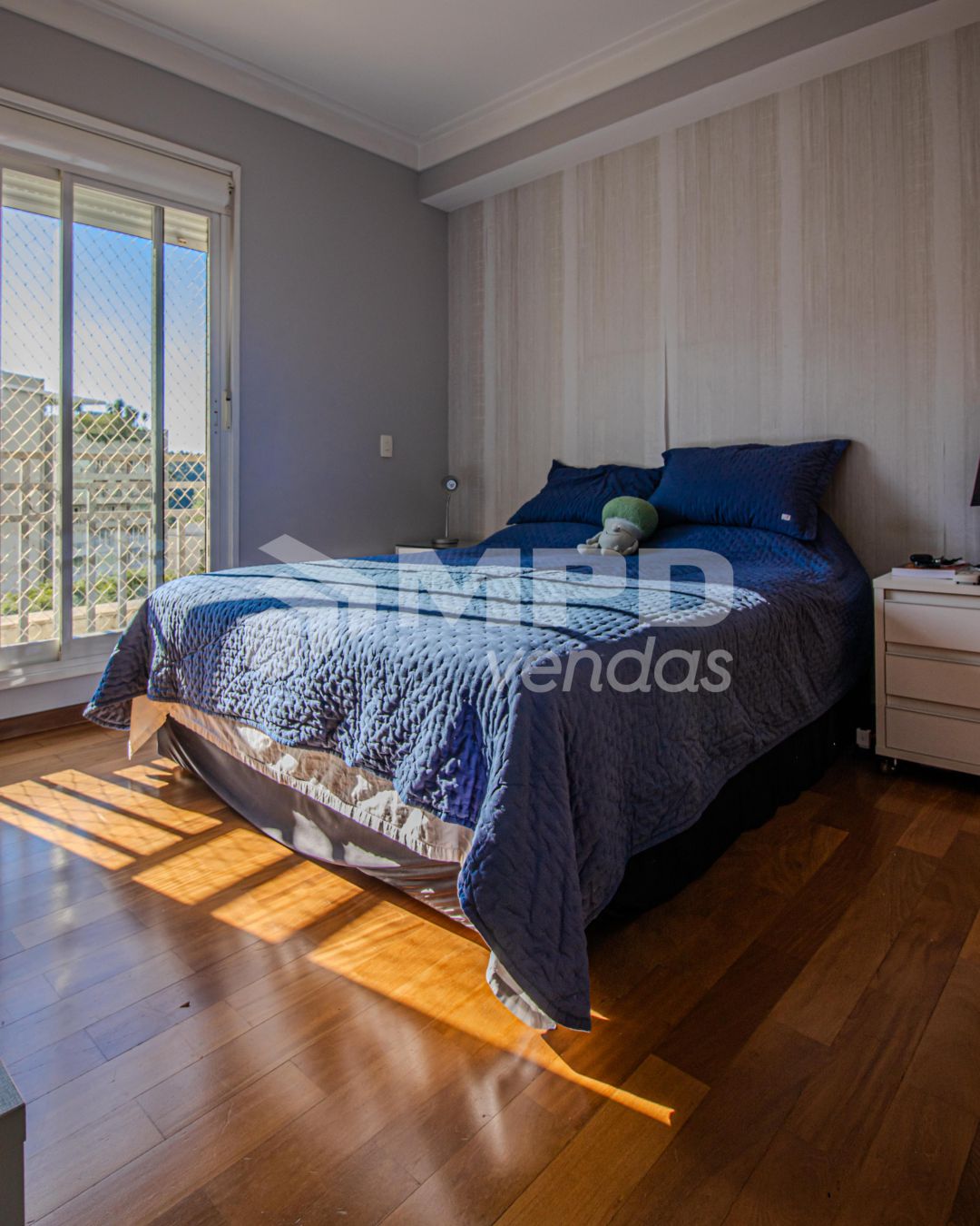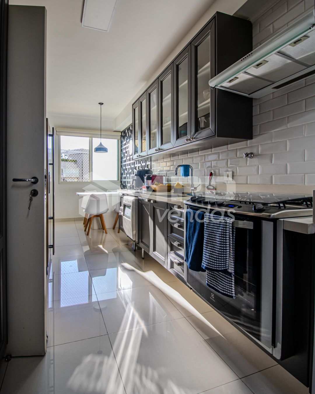 Piso porcelanato na sala e cozinha, piso de madeira nas suítes;